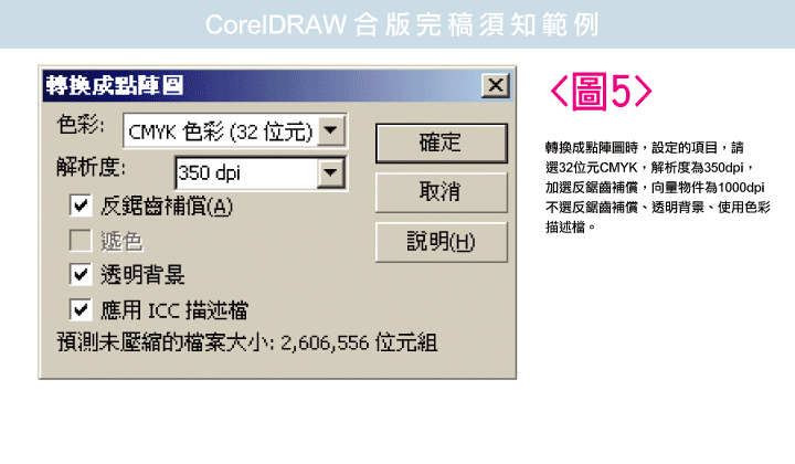 使用到「透明度」、「濾鏡」、「特殊材質填色」、「Powerclip物件」、「輪廓圖」、「漸變」、「立體化」等效果,皆需轉成CMYK格式的點陣圖,以避免顏色不符、露白等狀況。<如點右圖4所示> |